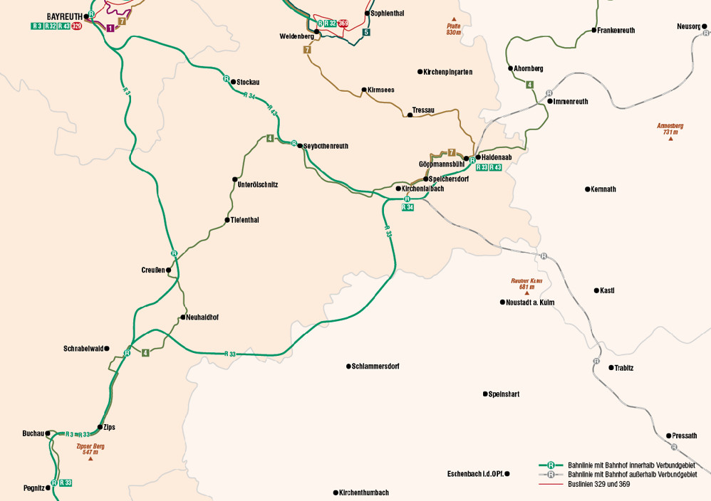 Hinweis: Der Bus der Linie 369 wartet auf die Fahrgäste von verspäteten Zügen aus Bayreuth am Endbahnhof Weidenberg, so dass Sie wegen der knapp angegebenen Umsteigezeit von 1 Minute keine Bedenken haben müssen. Der Bus wird normalerweise zum nahtlosen Umsteigen erreicht. Sie sehen den Bus bereits, wenn Sie aus dem Zug aussteigen und in Fahrtrichtung den Bahnsteig vorlaufen.