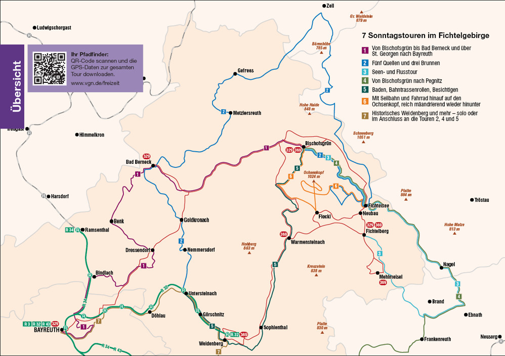 Die VGN-Freizeitlinie 329 verkehrt vom 1. Mai bis 3. Okt. an Sonn- und Feiertagen mit einem speziellen Anhänger für Fahrräder. Hiermit ist der Transport von bis zu 20 Fahrrädern möglich. Ab Bayreuth Hbf. fährt die OVF über Goldkronach, Bad Berneck und Bischofsgrün nach Fichtelberg.