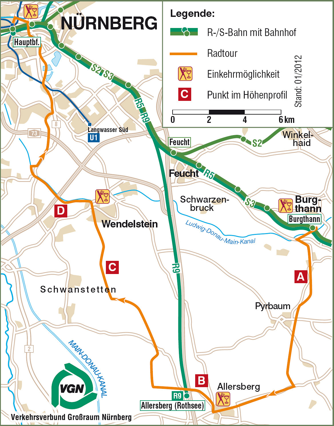 Einkehrmöglichkeiten: Ausreichend vorhanden. Die Schleuse 35 gleich zu Beginn, das Steinbrüchlein an den Toren Nürnbergs und der Wiesn Biergarten (auf der Wöhrder Wiese in Nürnberg) sind besonders zu empfehlen.