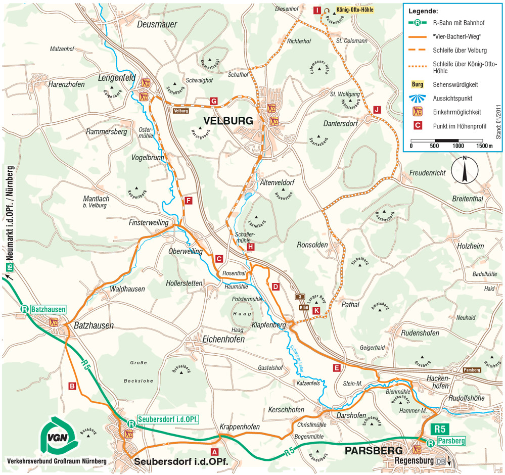 In den modernen Doppelstockwagen mit Fahrradabteilen der Regionalbahn RE 50/RB 51 erreichen wir ab Nürnberg Hbf in nur 37 Minuten Parsberg. Wir starten unsere landschaftlich sehr schöne, aber auch anspruchsvolle Tour vom Bahnhof aus nach rechts, vor bis zur Hauptstraße. Bereits hier erkennen wir auf der gegenüberliegenden Straßenseite die blaue Markierung des „Vier-Bacherl-Weges“.