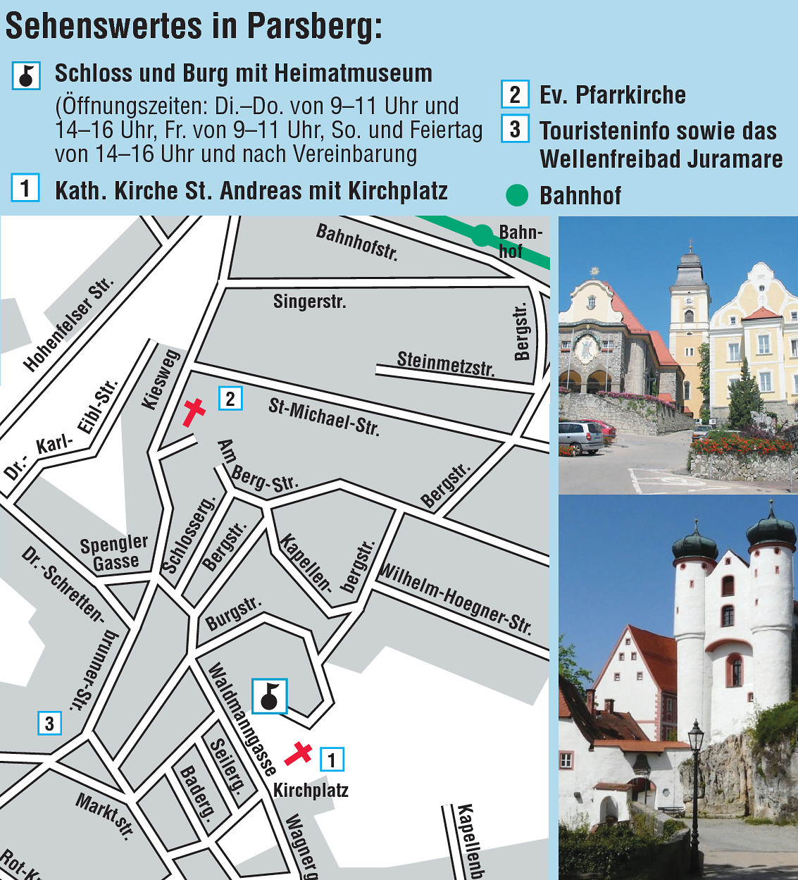 Ab hier folgen wir der Beschilderung, wie unter a) beschrieben, bis zurück nach Parsberg. Es ist keine Schande, die letzten Meter sein Rad bergauf zu schieben – auch bis zur Abzweigung in die Stadtmitte hinauf. Nehmen Sie sich die Zeit und beschließen Sie Ihren Aufenthalt im Oberpfälzer Jura in einer der zahlreichen Gaststätten rund um den Ortskern. Nimmermüde können natürlich auch noch einen Besuch auf der Burg (Burgmuseum) oder in einer der sehenswerten Kirchen unternehmen.