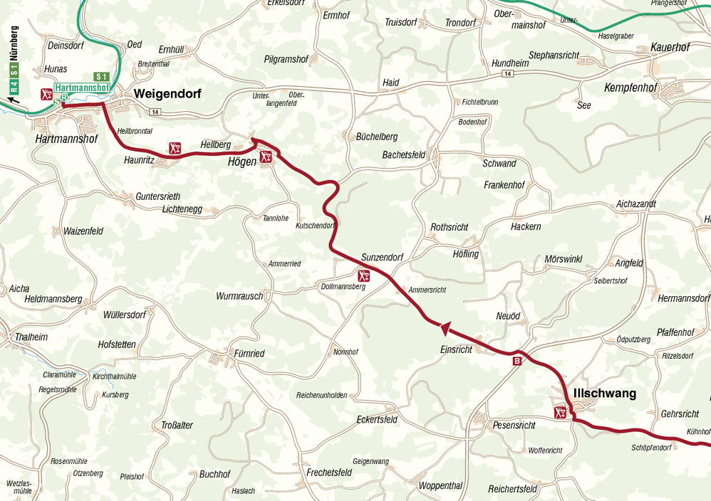 Schließlich Weigendorf. Vor dem Feuerwehrhaus links, am alten Barock-Grenzstein vorbei über die Brücke und vor zur Bundesstraße. Hier erst links, dann rechts auf den Radweg. Und letztendlich an der Ampel rechts zum Bahnhof Hartmannshof S1/