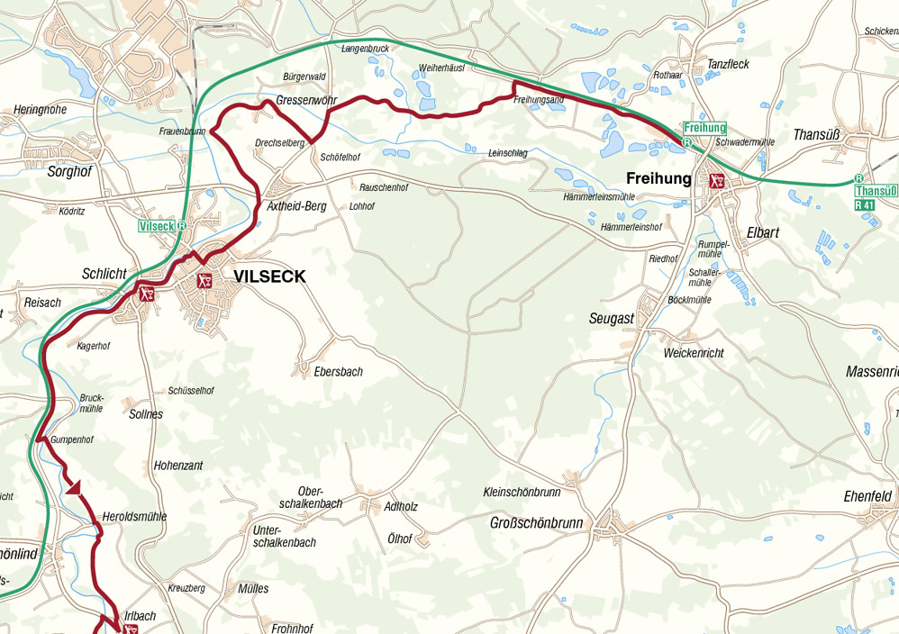In Freihung RE 41 raus aus dem Bahnhof und links. Kurz darauf mündet der Weg in die Straße nach Freihung. Wer keinen Abstecher dorthin machen will, dreht hier mit Spitzkehre rechts auf den Radweg neben der Straße, der nachts komfortabel beleuchtet ist.