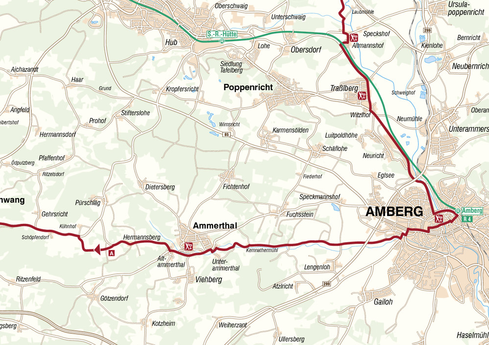 An der ersten Ampel geradeaus. An der zweiten – wir nähern uns der Amberger Innenstadt – über den Pfalzgrafenring links Richtung Bahnhof RE 40.