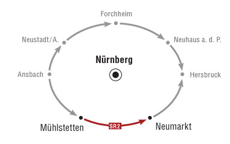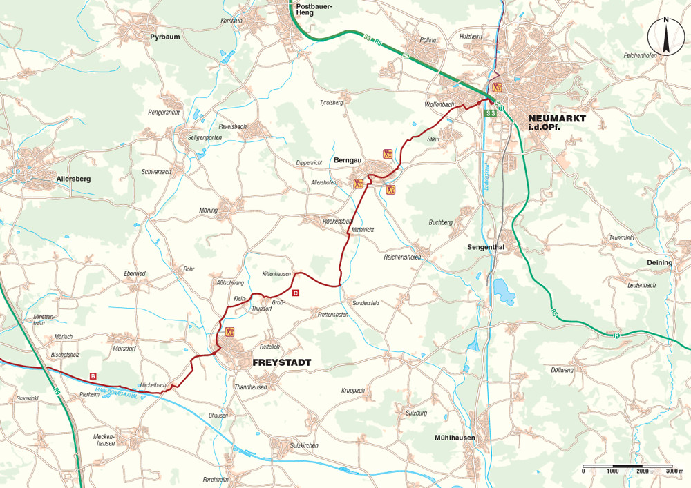 Über Kittenhausen und Mittelricht gelangen wir nach Berngau. Über die Hauptstraße radeln wir durch den Ort, schließlich am Sportgelände des FSV Berngau vorbei und danach nach links. Vor uns liegt der Staufer Berg, den wir nördlich umfahren. Stauf lassen wir rechts liegen und bleiben immer in gerader Fahrtrichtung in Richtung Neumarkt. Hier ist die Radwegbeschilderung leider etwas lückenhaft, daher bitte im Zweifel an der Fahrtrichtung orientieren. Wir überqueren die Bundesstraße 8 / 299 (Münchener Ring), fahren an einem weiteren Sportgelände entlang und gelangen dann geradeaus über die Hochstraße und danach nach rechts über die Schlossstraße zur Freystädter Straße. Weiter geht es nach links in Richtung Neumarkter Innenstadt. Über einen Kreisverkehr und die nachfolgende große Kreuzung sehen wir alsbald links von uns den Real-Markt. Davor überqueren wir die Straße und radeln weiter über die Dreichlinger Straße und danach nach links über die Hans-Dehn-Straße direkt zu unserem Etappenziel, dem Bahnhof Neumarkt