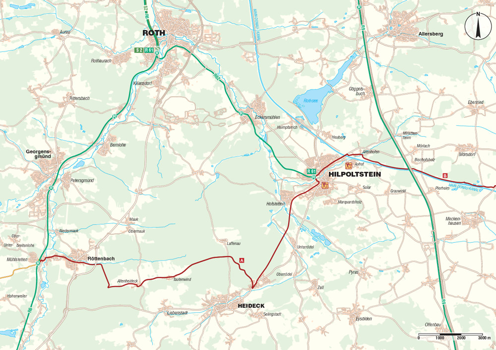 Unser Radwegweiser ist in diesem ersten Abschnitt unserer Tour die Markierung „Fränkischer Seenlandweg“. Nach rechts überqueren wir die schwäbische Rezat und fahren geradeaus weiter nach Röttenbach. Der Weg führt weiter geradewegs in östlicher Richtung über die Deutschherrenstraße aus dem Ort hinaus. Wir folgen nun dem Lauf des Röttenbachs, kommen an einigen Weihern vorbei und unterquerendanach die B 2. Kurz danach weist uns die Beschilderung nach rechts. Wir folgen den Forstwegen bis zur Einmündung in ein kleines asphaltiertes Sträßchen, das uns nach links nach Altenheideck führt. Gemütlich geht es weiter über verkehrsarme Nebenstraßen über Tautenwind in Richtung Hilpoltstein (Radwegbeschilderung).