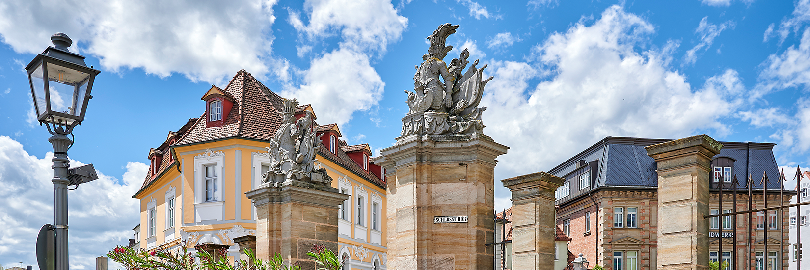 Du folgst nun kurz der Pfarrstraße und erreichst nach kurzer Zeit den Martin-Luther-Platz. Unübersehbar dort: die Kirche St. Gumbertus und der Markgraf-Georg-Brunnen.