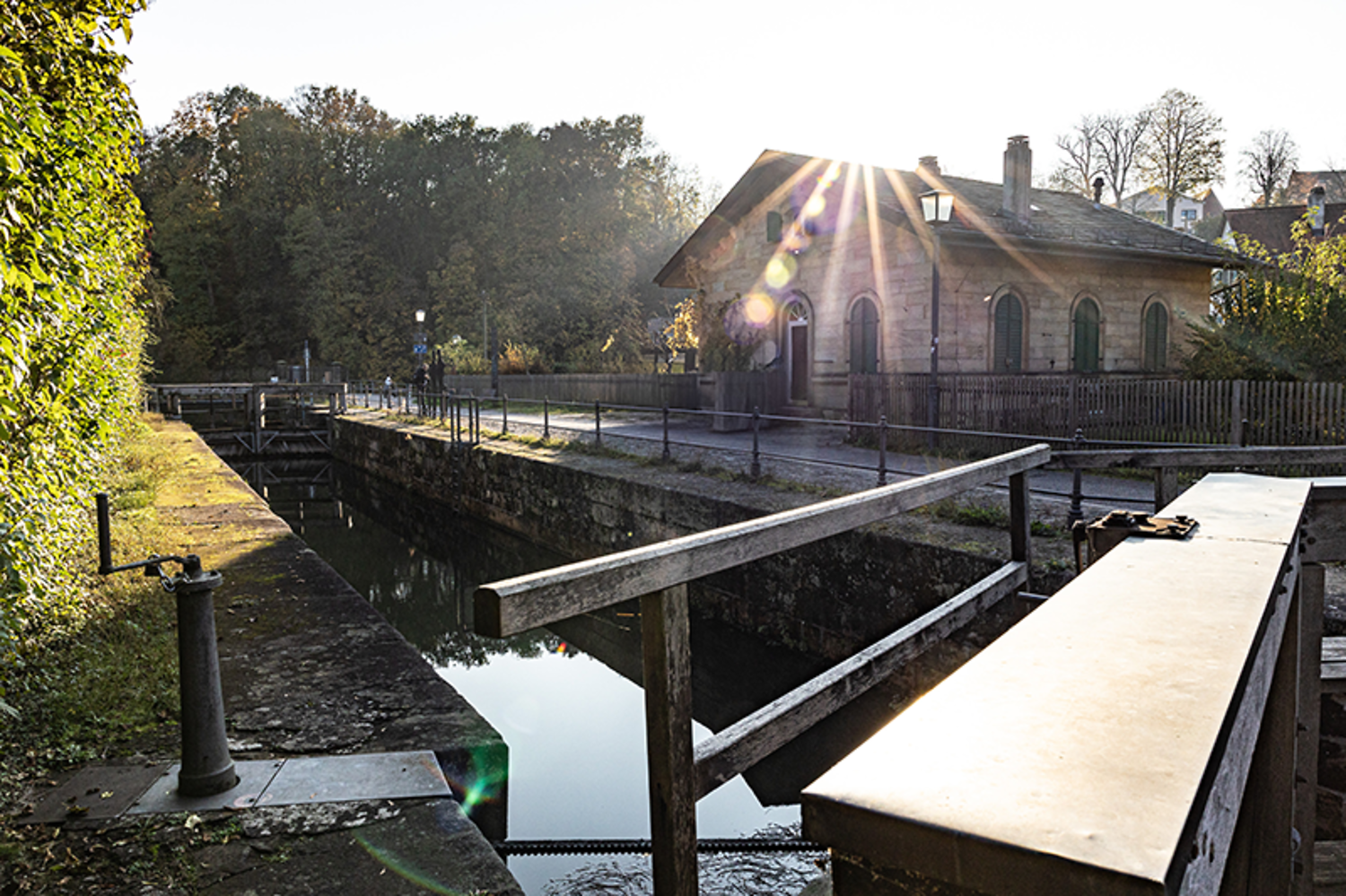 Du folgst nun dem Grünen Markt und der Habergasse und überquerst anschließend den Nonnengraben. Der Weg verläuft am Ufer des linken Regnitzarms, vorbei an alten Brücken, Bäumen und Bootsanlegern zur historischen Schleuse 100.