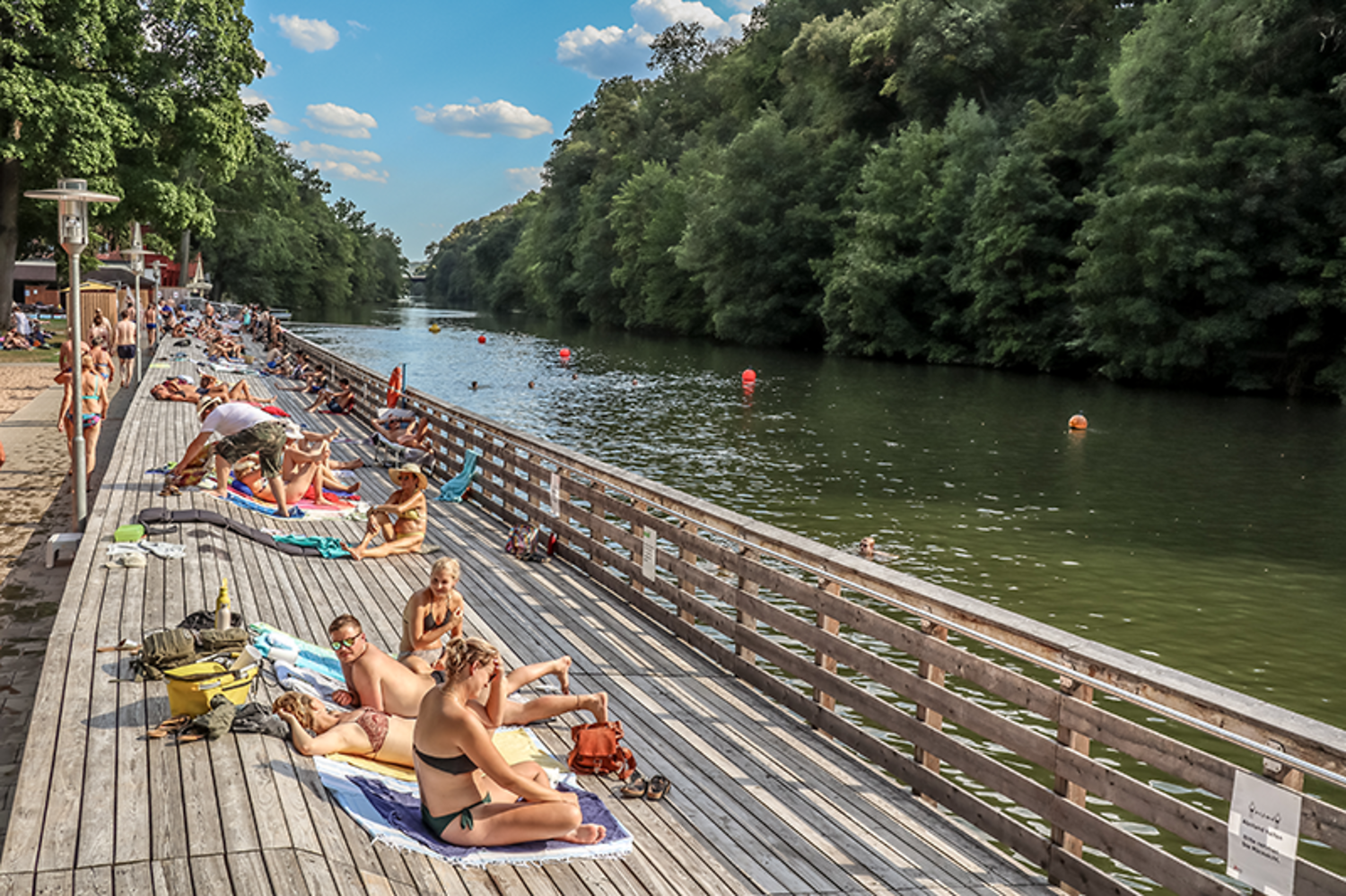 Es geht weiter entlang der Regnitz. Über schattige Uferwege erreichst du nach ca. 1,5 km die beliebte Hainbadestelle mit Bade- und Einkehrmöglichkeit.