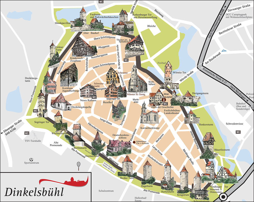 Ausgangspunkt für unseren Rundgang ist die VGN-Haltestelle am Bahnhof. Über den Parkplatz „Schwedenwiese", durch das Wörnitztor gelangt man über den Altrathausplatz - auf dem sich das Haus der Geschichte mit der Tourist-Information befindet - zum Münster St. Georg und dem Weinmarkt mit der Schranne, dem Deutschen Haus (Renaissancefassade) und dem Gustav-Adolf-Haus. In der Segringer Straße, gegenüber dem Gustav-Adolf-Haus, liegt der Eingang zum Hezelhof, dem malerischen Innenhof eines Patrizierhauses aus dem 16. Jahrhundert.