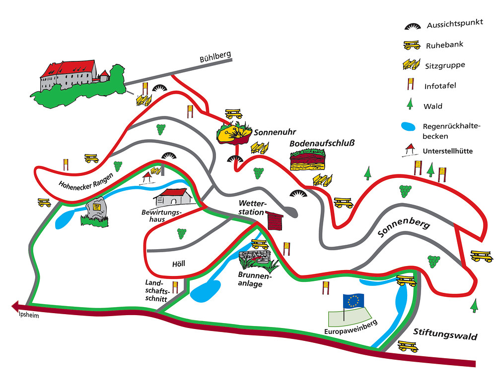 Eine Besonderheit für Wanderer und Spaziergänger ist der Ipsheimer Wein-Wander-Weg „Burg Hoheneck“, der in ein bis zwei Stunden auf frei wählbaren Routen um die rund 35 ha großen Rebanlagen führt. Die Ipsheimer Winzer erwarten im neuen Bewirtungshaus die Wanderer an Sonn-tagen von April bis November mit erfrischenden Weinen und fränkischen Brotzeiten.