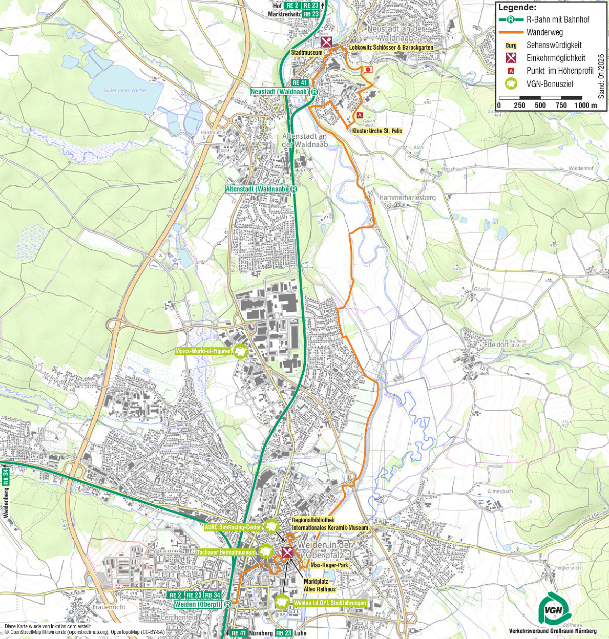 Glaskunst und Barock, Urban Gardening und ein Komponist von Weltrang. Diese Tour führt dich auf gut 13 Kilometern vom beschaulichen Neustadt an der Waldnaab ins belebte Weiden und ist in einer guten Stunde von Nürnberg aus mit dem RE 41 erreichbar.