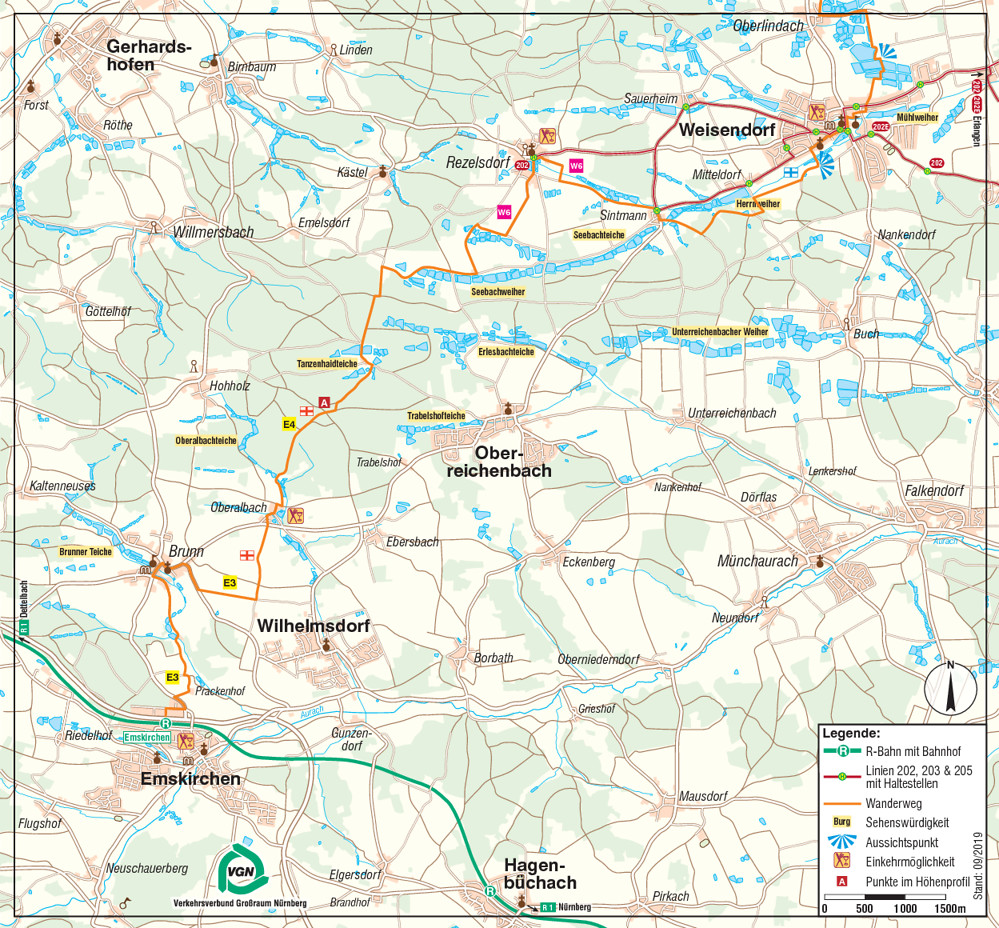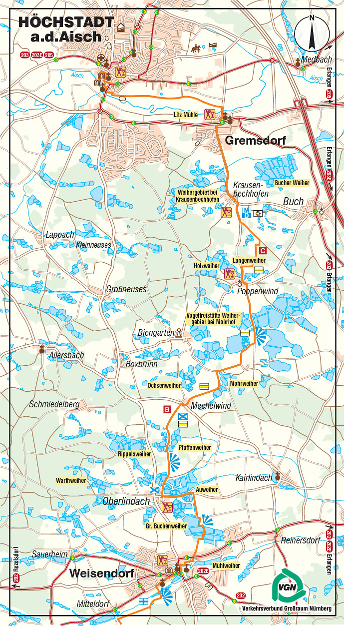 oder S6 zum Startpunkt am Bahnhof Emskirchen. Je nach Ziel können Sie in Weisendorf in den Bus 202 , in Gremsdorf oder Höchstadt a. d. Aisch in die Busse 203E (Schnellbus) und 205 nach Erlangen einsteigen, um von dort aus mit der S1 oder