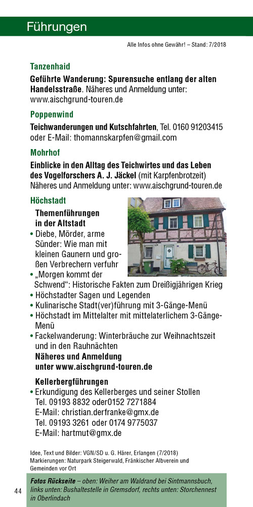 Kann direkt im Anschluss mit Teil 2 zusammengelegt, aber auch mit den regelmäßigen Busanschlüssen als Kurzwanderung gemacht werden: Ein Spaziergang mit Blick auf Höchstadt durch den unverbauten Aischgrund abseits der B 470, mit schönen Blicken und anschließendem historischen Altstadtbummel samt „Storchenrathaus“ und Abstecher zum einmaligen Kellerberg. Auch für Bierliebhaber ist Höchstadt nicht uninteressant.