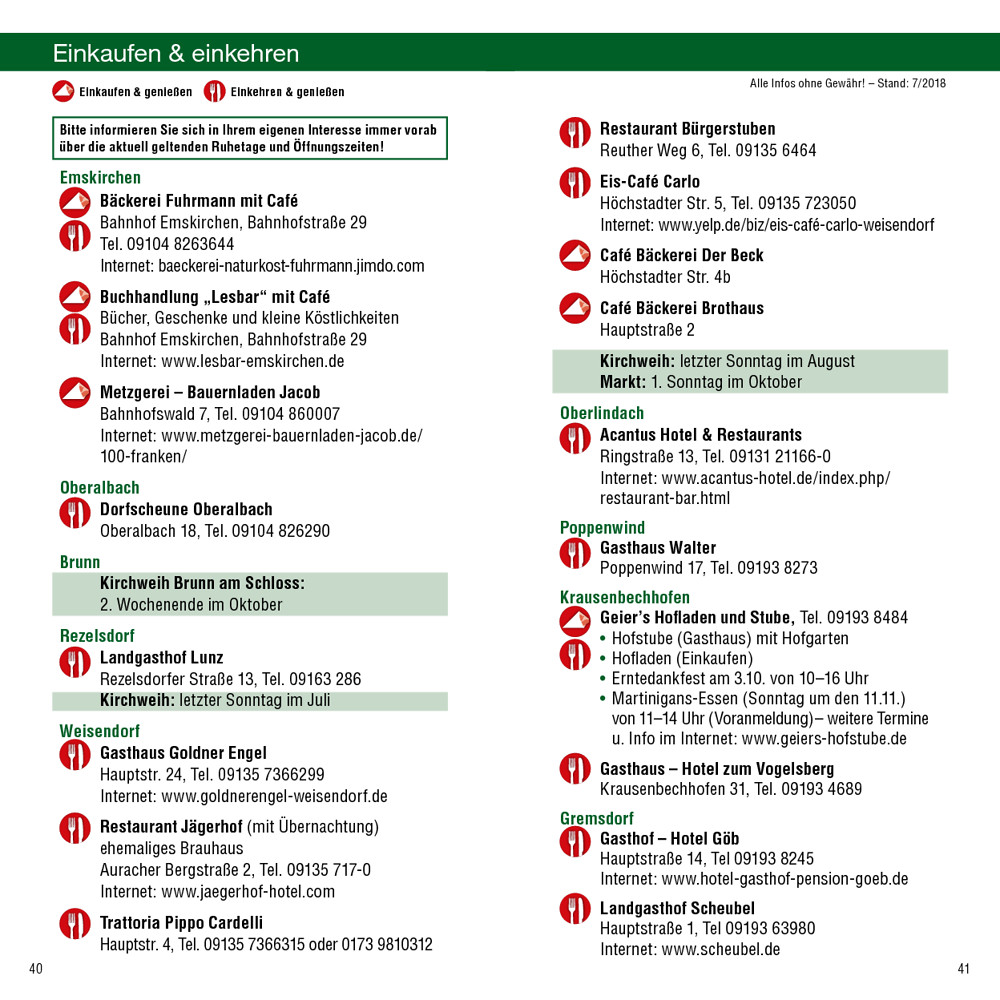 Die Dorfscheune neben dem Feuerwehrhaus ist nur Sonntagnachmittag und Montagabend (sowie auf Voranmeldung, Info siehe Anhang) bewirtschaftet. Ansonsten gibt’s einen Spielplatz und Brotzeitbänke. Außerdem (als Abstecher, 130 m, rechts abbiegen) hinter dem großen idyllischen Dorfweiher einen Brunnen mit frischem Wasser (und weiterer Brotzeitbank), der auch als Osterbrunnen schön geschmückt wird!
