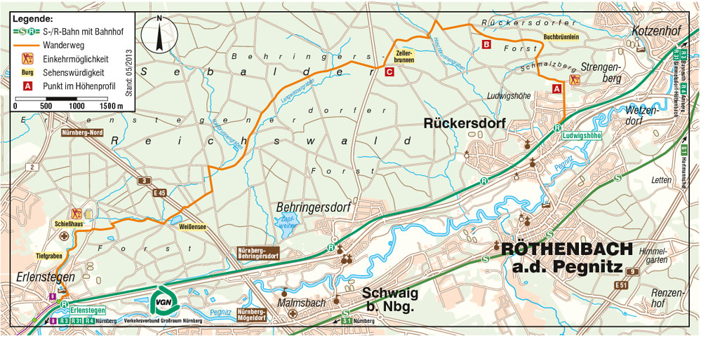 Bei dieser kurzweiligen Tour durch den Behringersdorfer und Erlenstegener Forst ist Rucksack-Proviant empfehlenswert, denn nur gegen Ende der Wanderung bestehen Einkehrmöglichkeiten. Auf überwiegend schattigen Waldwegen und Pfaden, vorbei an zahlreichen kleinen Brunnen und Wassergräben, wechseln oft die Wegezeichen. Dank der hervorragenden Ausschilderung durch den Fränkischen Albverein findet man sich aber immer prima zurecht. Sehenswert im letzten Abschnitt der Route ist vor allem die wildromantische Sandsteinschlucht Tiefgraben, Teil der SandAchse Franken.