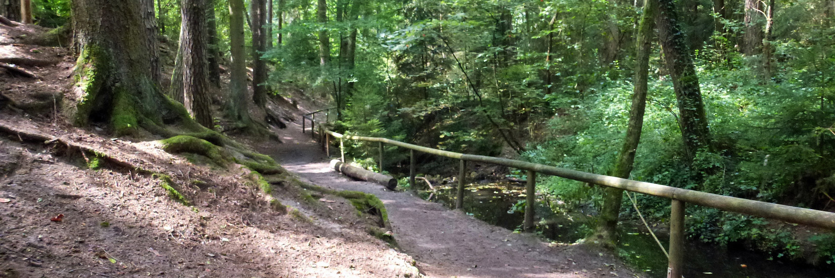 führen uns zusammen am Gelände des Waldrestaurants entlang und weiter bis zum Tiefgraben. Ihnen folgen wir nach links durch die romantische Sandsteinschlucht entlang des Bachlaufs.