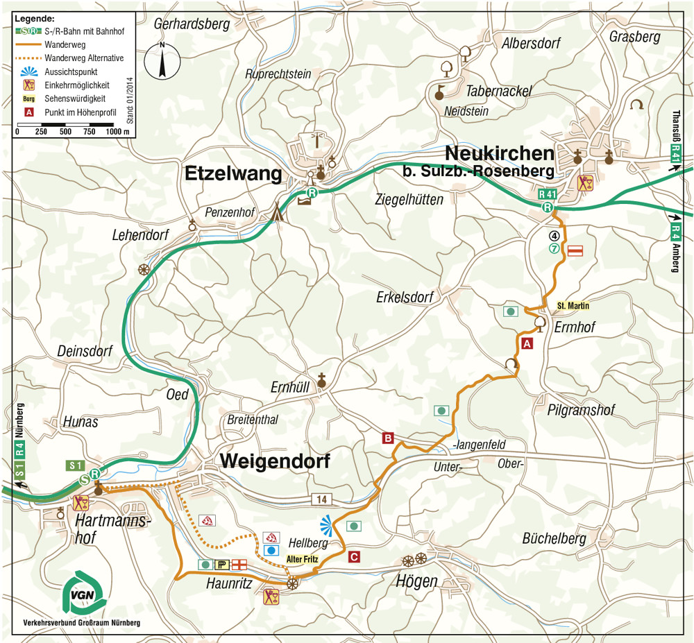 Auch wenn das Laub sich einzufärben beginnt und die Tage kürzer werden, kann man auch noch kurzweilige Wanderungen unternehmen. Am Rande des Sulzbacher Berglandes verläuft diese Tour am Fußes des Buchenberges entlang und an der Informationsstätte der ehemaligen, frühmittelalterlichen St.-Martins-Kirche vorbei. Nach einer schattigen Waldpassage folgt der Anstieg hinauf nach Weigendorf, dann zweimal zum „Alten Fritz“ – zunächst zur imposanten Felsnadel, dann in die gleichnamige Gaststätte. S- oder R-Bahn bringen die Wanderer von Hartmannshof aus zurück in den Ballungsraum.