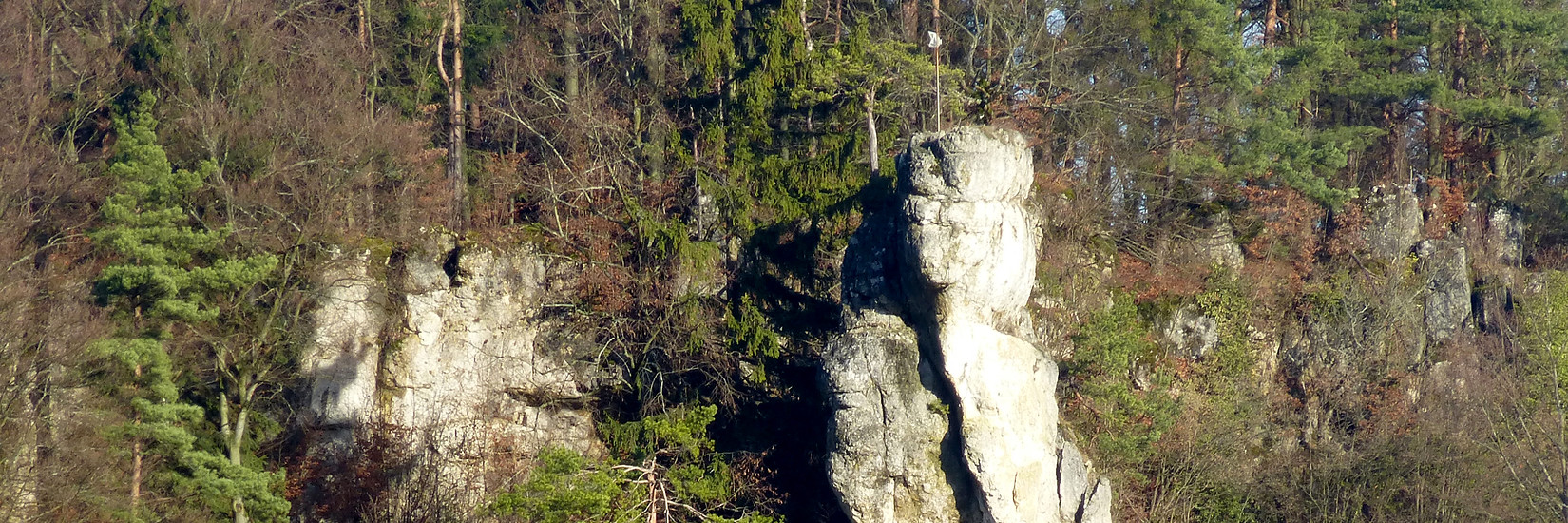 Oben am Waldesrand nur kurz rechts, dann gleich wieder links, der Weg führt ein Stück auf einer alten Begrenzungsmauer entlang. Wieder nach unten, im Zickzack durch die Felder und bei den überdimensionalen Wegezeichen des Fränkischen Albvereins in den Wald hinein. Ein breiter Waldweg nimmt uns auf, ihm folgen wir nach rechts Richtung Haunritz. Aufmerksam achten wir auf dieser Passage auf den rechten Wegesrand: zwar gut ausgeschildert – aber doch unvermittelt – führt ein Pfad rechts abwärts. Unserem