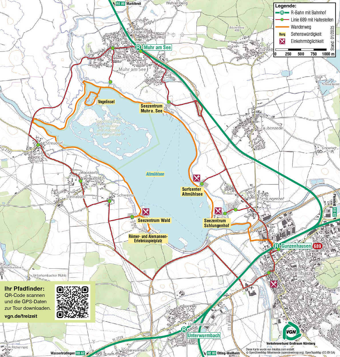 Seezentrum Schlungenhof. Die Buslinien 689 , 640 und Rufbus 642.1 bringen dich zum Bahnhof Gunzenhausen (alternativ: Fußweg ca. 1,5 km) mit guten Anschlüssen von