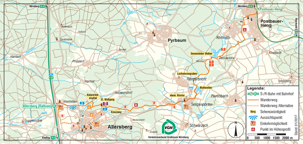 Auf anfangs überwiegend unmarkierten Schleichwegen, die eigentlich nur Einheimische kennen, verlassen wir die am Fuße des Dillbergs liegende Gemeinde Postbauer-Heng S3. Vorbei an zahlreichen Weiherketten, bieten sich dann in Seligenporten – fast genau bei der Hälfte der Strecke – Einkehr- und Besichtigungsmöglichkeiten an. Danach kann man ab der kleinen Kapelle St. Wolfgang wählen, ob man direkt durch das Tal der Kleinen Roth oder über Allersberg die Rückfahrt mit der S5/RE 1 vom Bahnhof Allersberg (Rothsee) antreten will.