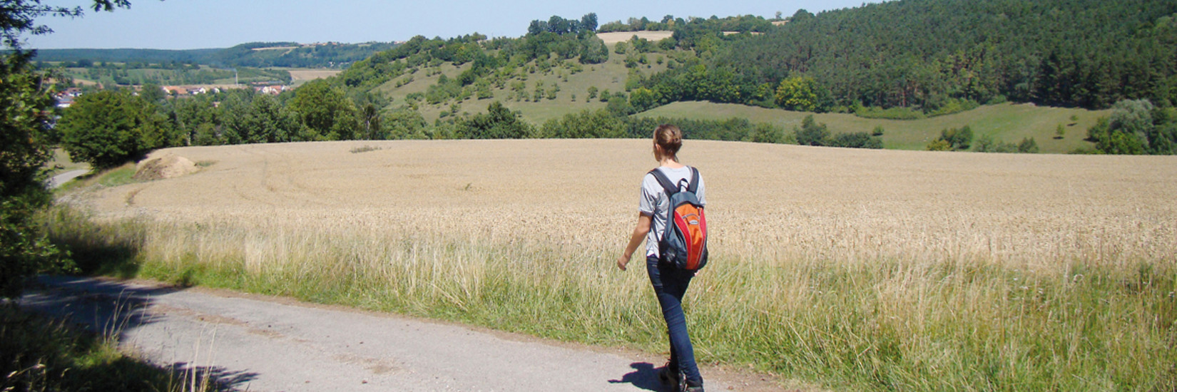 als zusätzliche Orientierungshilfe. Wir queren die Lifttrasse und schlendern gemütlich nach unten, genießen den schönen Ausblick und erreichen den Ortsrand von Neuhof a. d. Zenn (km 7,4).