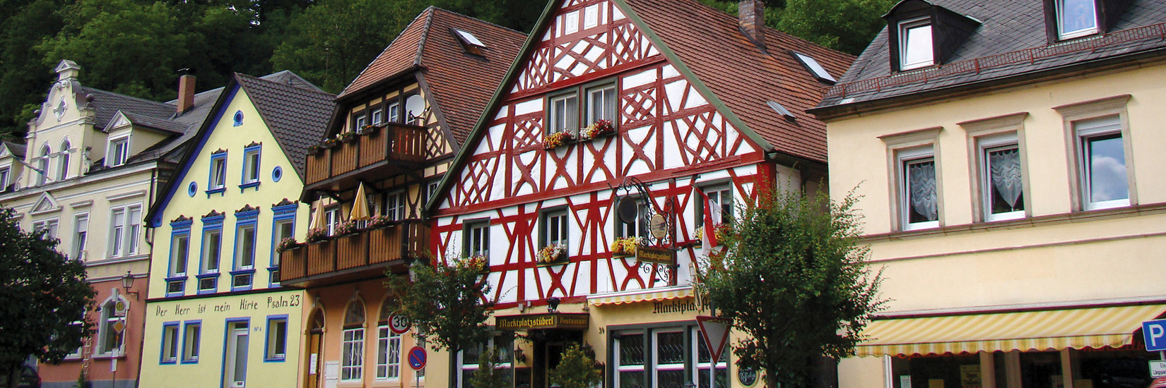 Serpentinenartig abwärts bis zum Flussbett, lohnt auch hier ein Abstecher nach rechts zum idyllischen Kurpark. Wieder zurück, queren wir den Fluss erst bei der zweiten Brücke und kommen so ins Zentrum des Luftkurortes mit seinem romantischen Marktplatz, schmucken Fachwerkhäusern und zahlreichen Einkehrmöglichkeiten, die sich entlang der Rother- und Bahnhofstraße fortsetzen. Von oben herab grüßt und verabschiedet uns gleichzeitig der Schlossturm (Freilichtbühne im Sommer) auf dem Weg zu einer der Bushaltestellen im Ort.