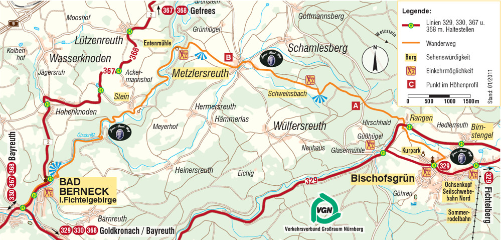 Durch die Erweiterung des Verbundgebietes im letzten Jahr ergeben sich natürlich immer mehr neue Ausflugsmöglichkeiten. Die dadurch entstehenden längeren Fahrzeiten kann man aber abwechslungsreicher gestalten, wenn man z. B. bei dieser Tour vor oder nach der Wanderung einen Zwischenstopp in Bayreuth einlegt und so die Fahrt nicht „an einem Stück“ zurücklegt. Durch dichte Fichtenwälder gewinnen Sie im Mittelteil der Wanderung Ein- und Aussichten in die Landschaft des westlichen Fichtelgebirges, fernab der Hauptwanderrouten. Der Weg nach Bad Berneck führt durch das schattige Ölschnitztal und den romantischen Kurpark.