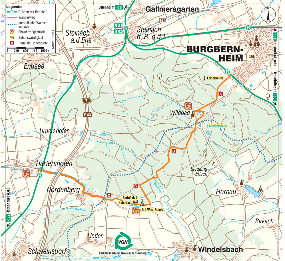 Diese schöne Wan­de­rung führt euch vom Bahn­hof Burgbernheim-Wildbad RB 80 zu einem regelrechten Frei­zeit-Eldorado für Kinder. Ent­lang des Bachlaufes des Weihergrabens könnt ihr durch eine kleine Westernstadt laufen, auf Pferden reiten, im Naturschwimmbad baden, euch auf dem Wasserspielplatz austoben oder auf dem Barfußpfad die ver­schie­denen Untergründe ertasten und spüren, bis euch nach dem letzten Stück Wan­de­rung zum Bahn­hof in Hartershofen RB 82 der Zug wieder nach Hause bringt. Damit ihr genügend Zeit in der Old-West-Ranch und im Naturschwimmbad habt, solltet ihr schon früh zu eurer Wan­de­rung aufbrechen.