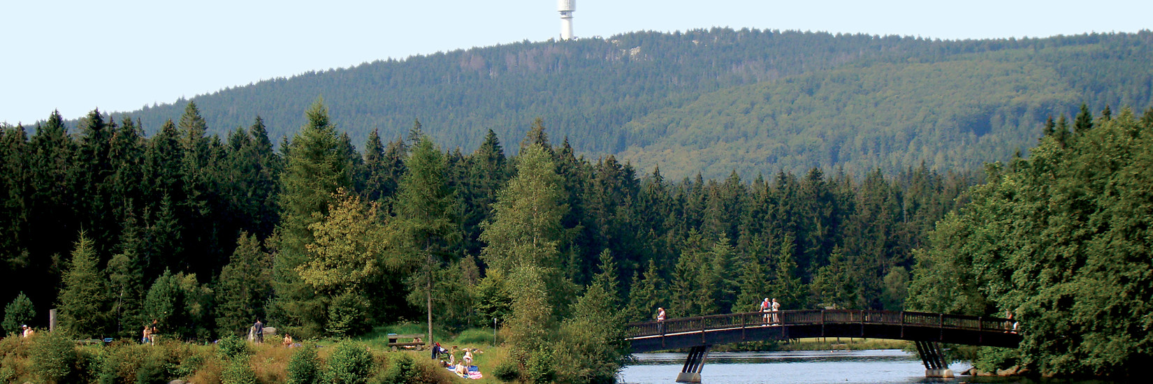 Links am Ufer entlang blieten sich in Richtung "Waldhotel am Fichtelsee" immer wieder schöne Ausblicke über den See, den Damm, die Uferpromenade oder die Stege, die auf die andere Seeseite führen („Waldhotel am Fichtelsee“, Tel. 09272 964000, Internet: www.fichtelsee.de, kein Ruhetag).