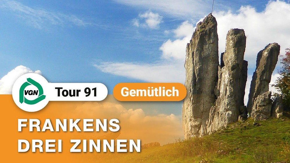 nach links und über die Hochebene durch Kemmathen bis nach Großenohe mit Einkehrmöglichkeit und der Felsformation Drei Zinnen.