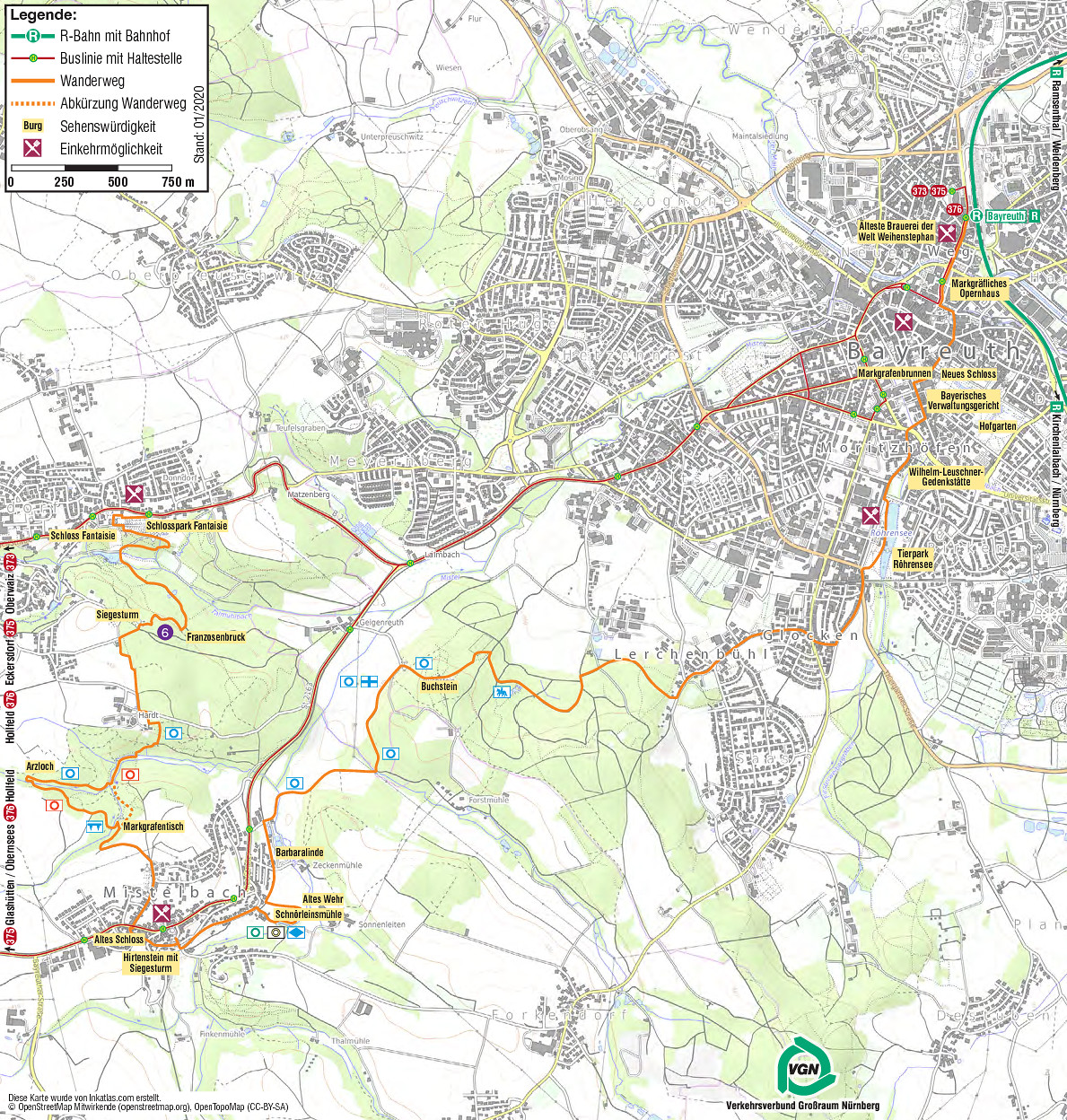 Auf dieser kurzweiligen Wanderung im westlichen Teil des Landkreises Bayreuth gibt es viel zu entdecken. Besonderes Augenmerk richtet sich auf die Naturschönheiten und zwei Wasserspiele. Nach einem ausgiebigen Spaziergang durch den Schlosspark folgen wir den Spuren der Prinzessin Friederike durch den Fantaisie-Wald zu weiteren Sehenswürdigkeiten. In Mistelbach erwartet uns dann, etwas versteckt, das Alte Wehr. Über den Buchstein geht es auf verkehrsberuhigten Wegen zum idyllischen Tierpark Röhrensee sowie von dort aus durch die Innenstadt Bayreuths zum Bahnhof zurück. Um die komplette Wanderung zu machen, sollte man gut zu Fuß sein. Auch ist auf einigen Passagen Trittsicherheit gefordert.