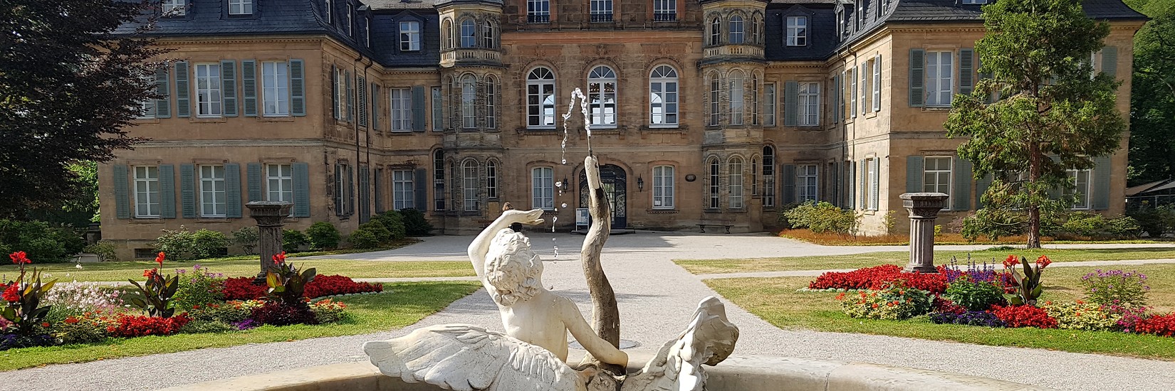 Residenz der Markgrafen von Brandenburg-Bayreuth, 1753-1757 erbaut nach Plänen von Joseph Saint-Pierre. Großen Einfluss auf die Gestaltung übte die künstlerisch begabte Markgräfin Wilhelmine aus, die einige ungewöhnliche, intime Räume des Neuen Schlosses wie ihr Musikzimmer mit Pastellbildnissen von Sängern, Schauspielern und Tänzern oder das Spiegelscherbenkabinett eigenhändig entwarf. Einzigartig ist auch das in Form eines Palmenhains gestaltete kostbare Palmenzimmer. In den eindrucksvollen Räumen des angrenzenden kleinen, aber bemerkenswerten Italienischen Schlösschens kommt das „Bayreuther Rokoko“ mit seiner Vorliebe für Blumenranken, Spalierzimmer und Grotten in seiner Spätform zu höchster Blüte. Zusätzlich zu den barocken Raumkunstwerken können das Museum „Das Bayreuth der Markgräfin Wilhelmine“, das Museum „Bayreuther Fayencen – Sammlung Rummel“, die Galerieräume (Zweigmuseum der Bayerischen Staatsgemäldesammlungen) mit niederländischen und deutschen Gemälden aus dem 18. Jahrhundert sowie die Sammlung „Galante Miniaturen – Sammlung Dr. Löer“ mit erotischen Darstellungen besichtigt werden. Quelle: Bay. Schlösserverwaltung