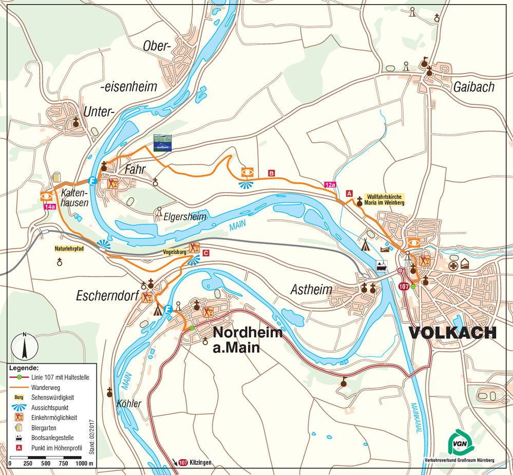 Mit der Mainfähre „Schorsch“ (Fährzeiten: Mo.–Fr. von 12–20 Uhr; Sa., So. u. Feiertage von 9–19 Uhr) geht es über den Main hinüber nach Kaltenhausen, wo wir auf einem kurzen Stück sogar den Landkreis Würzburg tangieren.