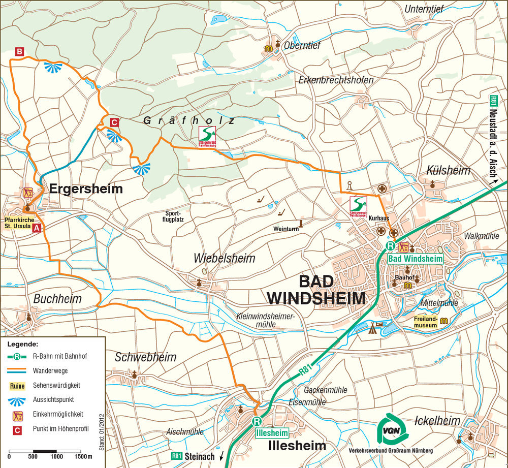 Es kann also praktisch nichts mehr schiefgehen. In einem schönen Tal, stets gut markiert, nach einer Kleingartenanlage rechts ab. Gleich wieder links, wir wandern in einem bewaldeten Streifen an einem größeren Weiher (Ruhebank am Ende) vorbei, immer den Wegezeichen nach auf Bad Windsheim zu. Vor allem im Herbst bilden die Bäume ein farbenprächtiges Spalier bis vor den Kurpark, dort rechts einbiegen und der Beschilderung zum Bahnhof folgen.