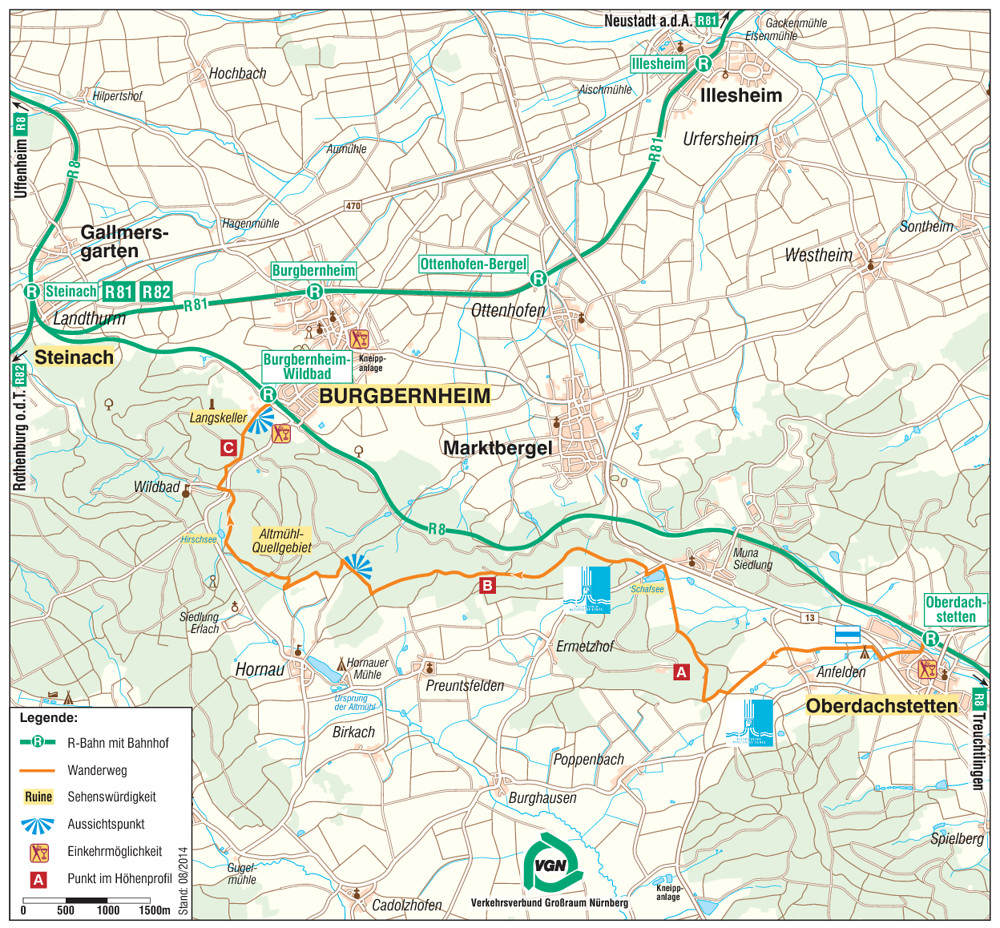 ) führt abwärts über die Kirchgasse, dann links zum Marktplatz mit dem Neuen Brunnen. Geradeaus weiter dann in die Rothenburger Straße und bei der nächsten Kreuzung schräg nach links zum „Alten Bahnhof“ in Burgbernheim an der RB 80.