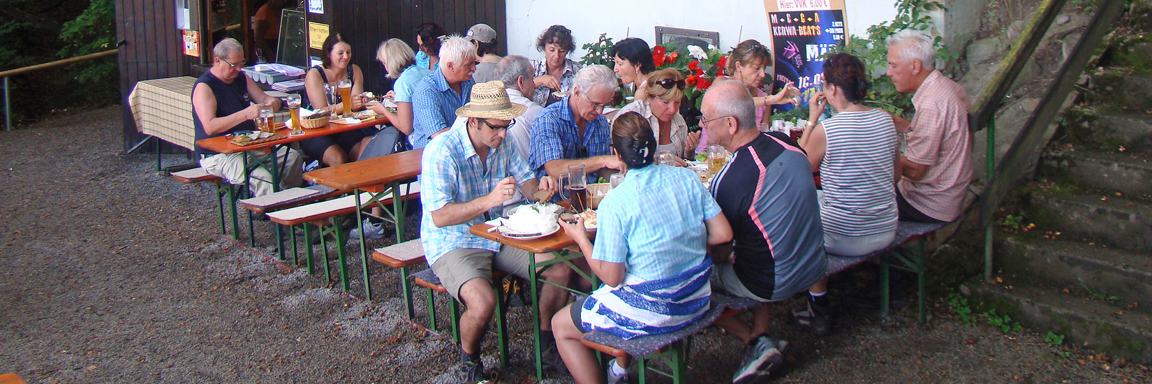 Ein Wiesenpfad führt zu einer Ruhebank und der Station „Rundumblicken“ am Schauberg. Wieder das Stück zurück, wir setzen den Weg weiter am oberen Rand der Obstwiesen fort. Bei der folgenden Gabelung ist der rechte Abzweig unser Weg. Kurz danach die Station „Landschaft mit Gesteinsarten“.