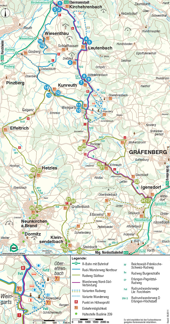 Die Nordtour rund ums Walberla ist ca. 21,7 km lang und kann erwandert oder mit dem Fahrrad befahren werden, auch wenn sie sich in der Formulierung bei der Wegbeschreibung in erster Linie an Wanderer richtet. Für zwei kleinere Teilabschnitte werden attraktive Varianten beschrieben, die auf weitgehend unbefestigten Wegen verlaufen, so dass sie für Wanderer sehr gut, für Radler nur mit entsprechend geländegängigen Fahrrädern geeignet sind. (© VGN GmbH)