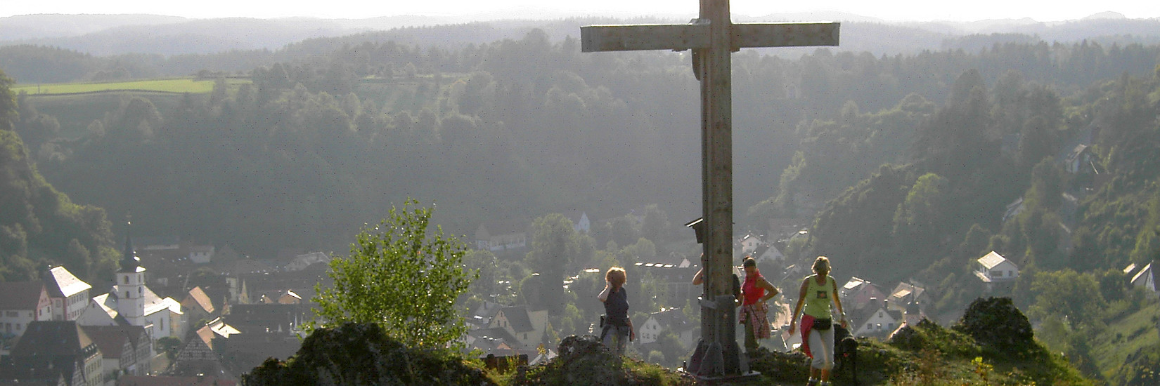 , kurz Richtung Ortsmitte, dann rechts in die Hauptstraße und immer geradeaus, vorbei an der katholischen Stadtpfarrkirche und an malerischen Fachwerkhäusern bis Mariental. Hier links über die Püttlach und weiter bis zur Haltestelle Mariental, wo wir rechts abbiegen in die schmale Gasse namens Fronfeste in Richtung Waldcafe. Gleich nach dem Salon „Haarscharf“ geht‘s steil links rauf zur Bergwachthütte. Es sollen 165 Stufen sein – wollen Sie nachprüfen?