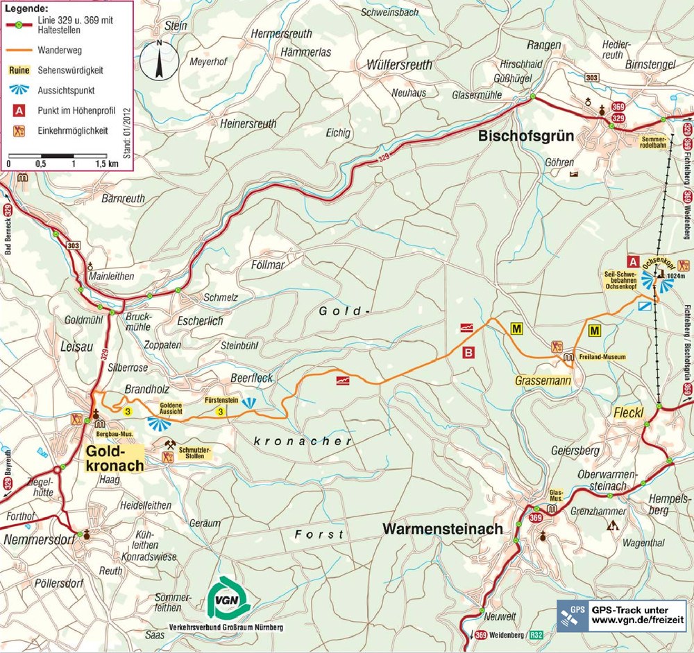 Nach einem Linksbogen am Friedhof vorbei, geht es danach linker Hand stets die Bernecker Straße entlang, hinein bis zur Bushaltestelle (Buslinien 329, 330, Mo.–Fr. auch 368) am Marktplatz. Vor der Rückfahrt nach Bayreuth, 16 Minuten Fahrzeit, kann man die Wanderung je nach Zeitlage in Goldkronach ausklingen lassen.