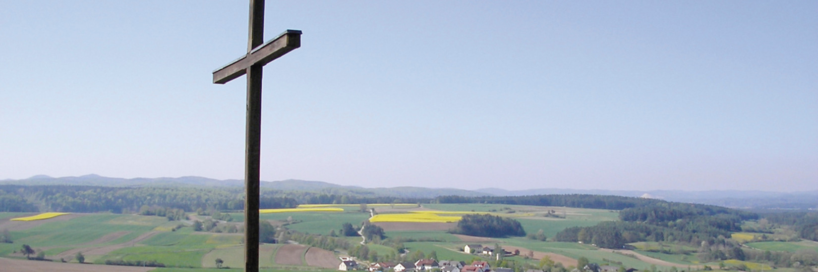 Um den Ausblick genießen zu können, entscheiden wir uns für den steileren Abstieg, aber nur ein Stück im oberen Teil. Dieser führt über die freie Fläche unterhalb der Kirche zunächst gerade auf die frei stehenden Bäume zu, dann halbrechts vor bis zum Holzkreuz (Titelfoto), wo uns am „Hohen Felsen“ ein herrlicher Ausblick über die Kuppenalb, den Veldensteiner Forst bis zur Frän­kischen Schweiz erwartet. Auch dort gibt eine Erzweg-Infotafel Auskünfte: hier über die bis 1970 von der Grube Nitzlbuch für den Erztransport über den Berg verlaufende Seilbahn. Ein ver­wach­se­ner Pfad, weiter mit dem Rotkreuz ge­kenn­zeich­net, führt unterhalb der Fels­for­ma­ti­onen nach unten. Unmittelbar nach dem letzten Felsen trennen sich im mitunter hohen Gras die Pfade, wir entscheiden uns, abweichend vom geraden Steilabstieg, für den rechten Abzweig. Weniger gewagt geht es jetzt ohne We­ge­zei­chen abwärts.