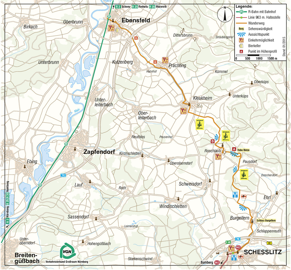 Wie gehabt begleitet uns die 8 bis zum Bahnhof nach Ebensfeld (3,2 km). Geradewegs am Bach entlang,führt der Weg zur nächsten Brücke, die wir nach links überqueren. Gleich danach rechts und weiter durch die Autobahnunterführung. Dahinter bis zum anschließenden Querweg und dort links abbiegen. Zum schon sichtbaren Keller geht es nur noch wenige Meter nach oben. Dort warten neben vielen Bierspezialitäten, darunter der bekannte Adam-Riese-Urtrunk, auch die eigens für den Engelhardt’s Keller gebraute „Kellerliebe“ aus dem Ebensfelder Brauhaus.