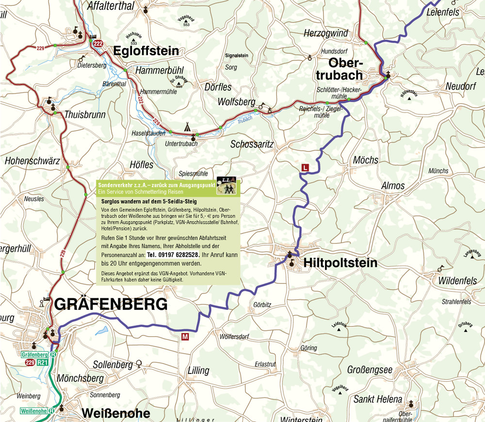. VGN-Anfahrt nach Obertrubach: Buslinien 222 (Mo - Sa) und 229 (Sa, So, Feiertag vom 1.5 -1.11) von Pretzfeld RB 22 oder Forchheim