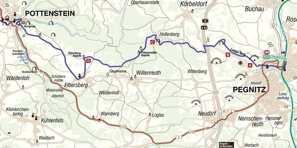 Pegnitz – Schlossberg – Voithhöhle – Hollenberg/Schlossruine – Pirkenreuther Kapelle – Elbersberg mit Kapelle und Jakobuskirche – Pottenstein