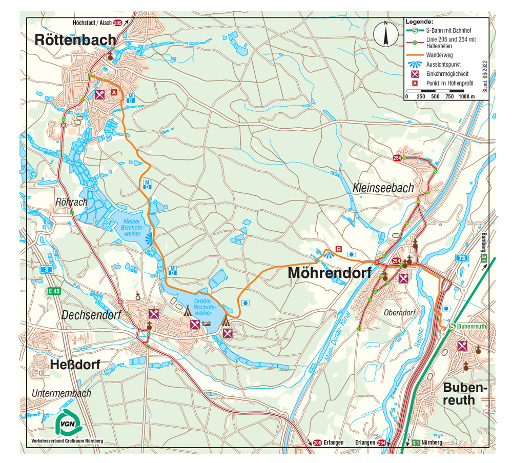 - so kann man sich auf das Wesentliche beschränken und die Tour auch in beide Richtungen wandern. Ausgangspunkt beider Varianten ist die gegenüberliegende Straßenseite vom Erlanger Bahnhofsgebäude. Hier steigen wir entweder in einen Bus der Linie 205 (nach Röttenbach) oder 254 (nach Möhrendorf).