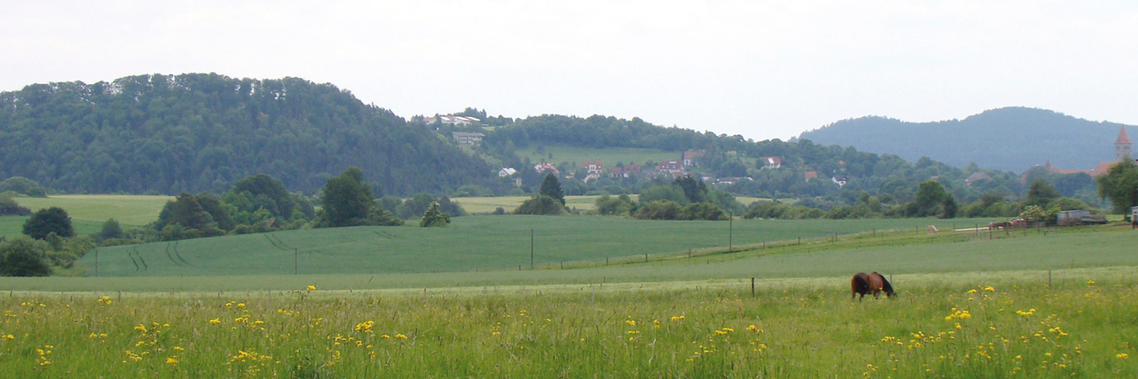 Dort zweigt unser Weg rechter Hand Rich­tung Sportanlage Mennersberg ab (Poppberg: 9 km) und führt auf einem asphaltierten Sträßchen ansteigend aus dem Lauterachtal hinaus. Nach dem Sportgelände des TuS Kastl noch einmal ein Blick zurück auf Kastl oder hinein ins Oberpfälzer Land. Nach Mennersberg, ent­lang der Koppeln der Men’s Hill Ranch, führt ein breiter Schotterweg im Rechtsbogen – ein nettes Eisenkreuz rechts am Rand – auf die freie Flur hinaus und ge­ra­de­aus in den Wald hinein (Ruhebank).