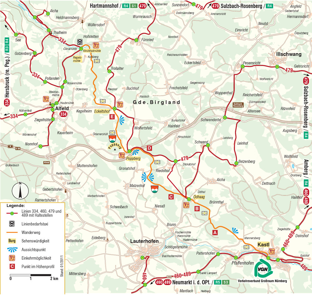 Unterhalb des imposanten, ehemaligen Benediktinerklosters mit seiner romanischen Kirche führt der Weg aus Kastl auf breiten Forststraßen hinauf auf die Höhenzüge, dann im Wald Rich­tung Ödhaag ins Birgland. Auf den gut markierten Wegen kann man oft die Stille der Natur genießen, in den einladenden Gasthöfen entspannt  einkehren und „sich werk­tags mit dem Bus, an Wo­chen­en­den und fei­er­tags sogar mit dem Linienbedarfs-Taxi LBT ohne Zuschlag auf Ihr VGN-Ticket nach Hers­bruck bringen lassen.“