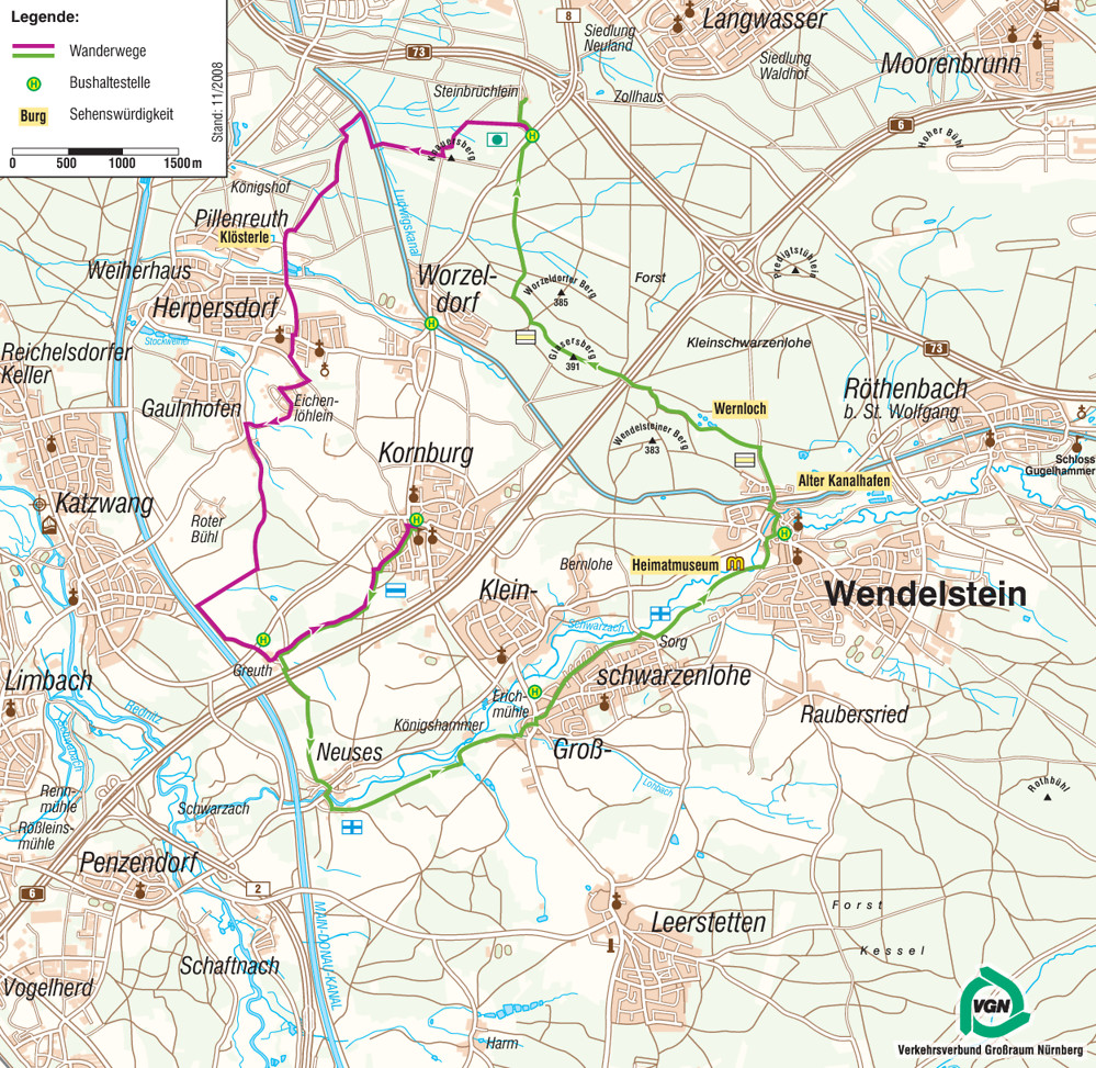 Im Linksbogen fällt der Weg später dann nach Wendelstein zur Schwarzach hinunter ab – die Spitzen der Kirche und das „Alte Rathaus“ als Anhaltspunkt. Am Ortseingang treffen wir im Enßerweg, kurz auf Kopfsteinpflaster, auf die Hauptstraße, in der wir rechts hoch zum Wendelsteiner Marktplatz laufen (9,3 km). Hier besteht von der Haltestelle „Altes Rathaus“ mit der Buslinie 602610 die Möglichkeit zur Rückfahrt nach Langwasser Mitte (Anschluss an die U1).