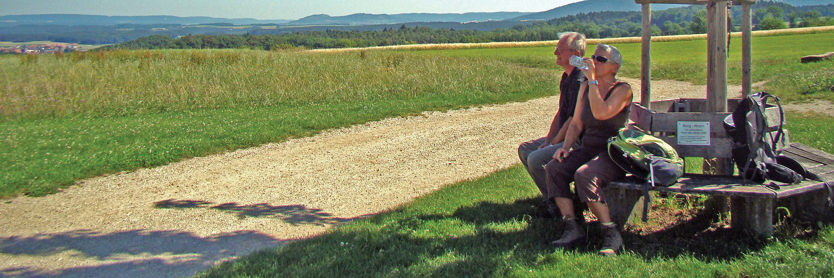Unscheinbar aber offenkundig sind wir ohne größere Anstrengungen am immerhin 390 m über N. N. gelegenen Marloffsteiner Pass angelangt. Über die Straße, dann wandern wir rechts neben dem Wasserturm weiter, auf ein Martel und eine Sitzgruppe mit Baum zu. Zeit für eine kleine Verschnaufpause bleibt – Ausblicke inklusive. Der