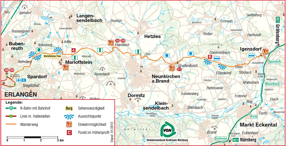 Mit einer der Buslinien 288 oder 289 ist es nur eine gute Viertelstunde vom Bahnhofsvorplatz bis zum Ausgangspunkt unserer Wanderung über die Höhenzüge zwischen Erlangen und Igensdorf. Bereits am Waldrand neben der Bushaltestelle Erlangen-Waldkrankenhaus empfangen uns die ersten Wegezeichen neben der neuen, hellblauen Wander- und Infotafel zum Wanderweg Kulturerlebnis Fränkische Schweiz.